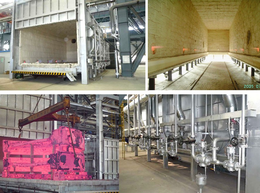 臺(tái)車(chē)耐火砌體采用高鋁定型磚結(jié)構(gòu),爐車(chē)與爐襯的密封采用自動(dòng)壓緊結(jié)構(gòu)。側(cè)密封的開(kāi)、閉與爐車(chē)進(jìn)出連鎖。